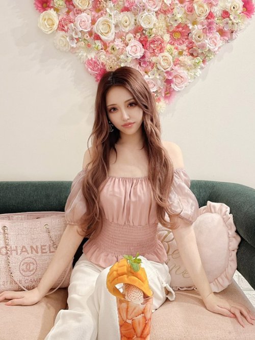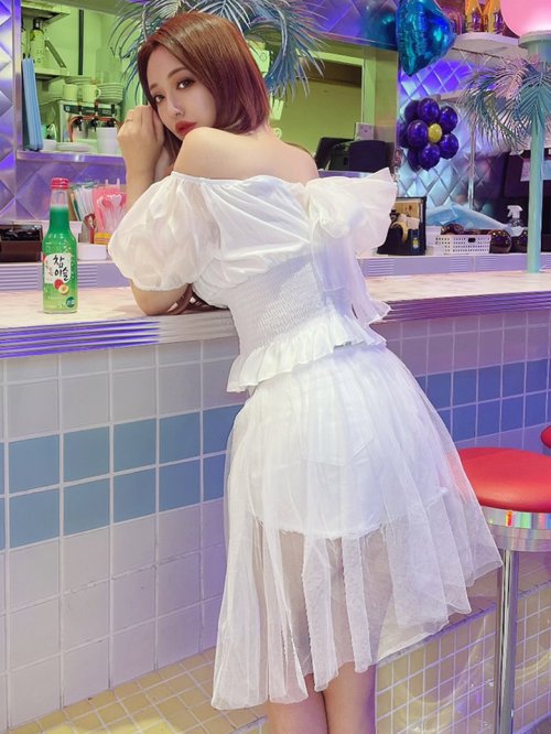 シアー素材のデコルテラインが上品な色気を演出。