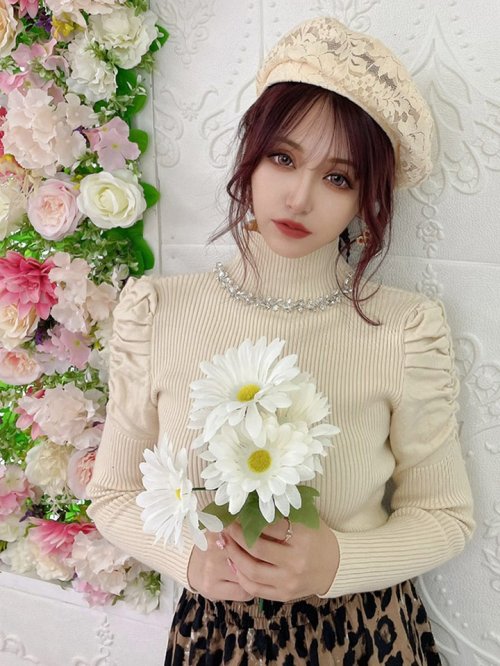ギャザースリーブビジューリブニットトップス [RNA663-BE]